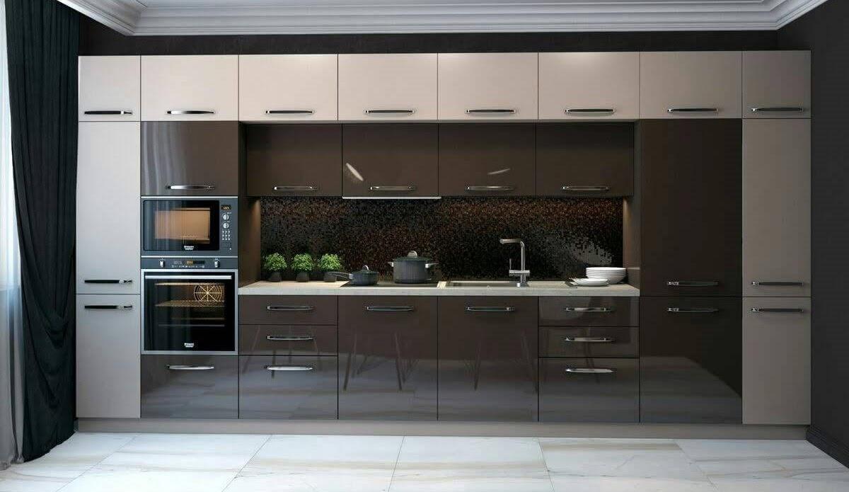 Parlak yüzeyli dolap kapakları, sofistike renk geçişleriyle birlikte derinlik hissi yaratırken; ankastre sistemler, mutfağın estetik bütünlüğünü tamamlıyor.